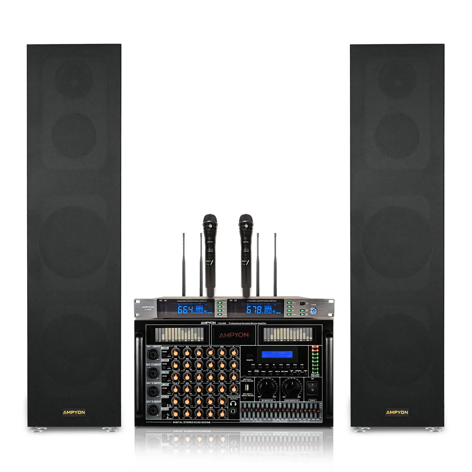 The Ampyon LXA-620 is a premium digital karaoke amplifier designed to deliver studio-quality sound and complete performance control. Perfect for both home entertainment and professional venues, it combines cutting-edge audio processing with user-friendly functionality to create an exceptional karaoke experience.