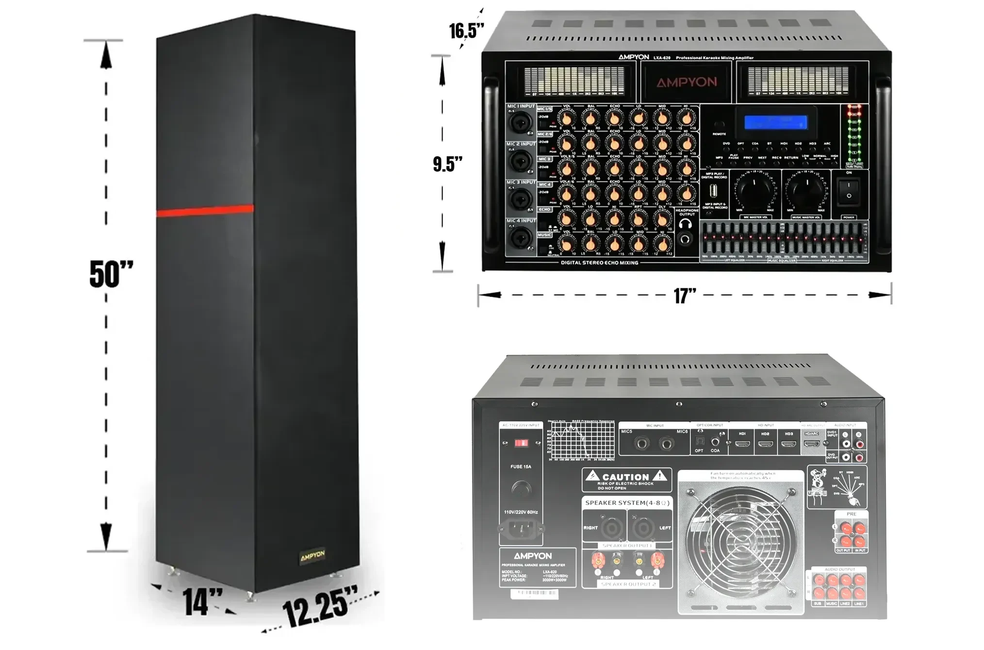| Phụ kiện đi kèm | 2 dây loa 12AWG, 1 dây quang Optical, dây micro XLR |